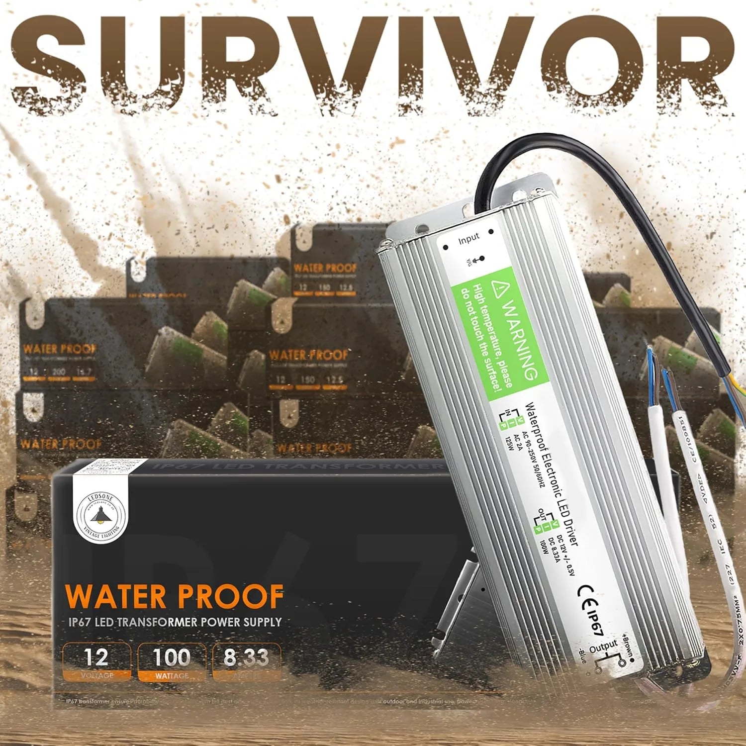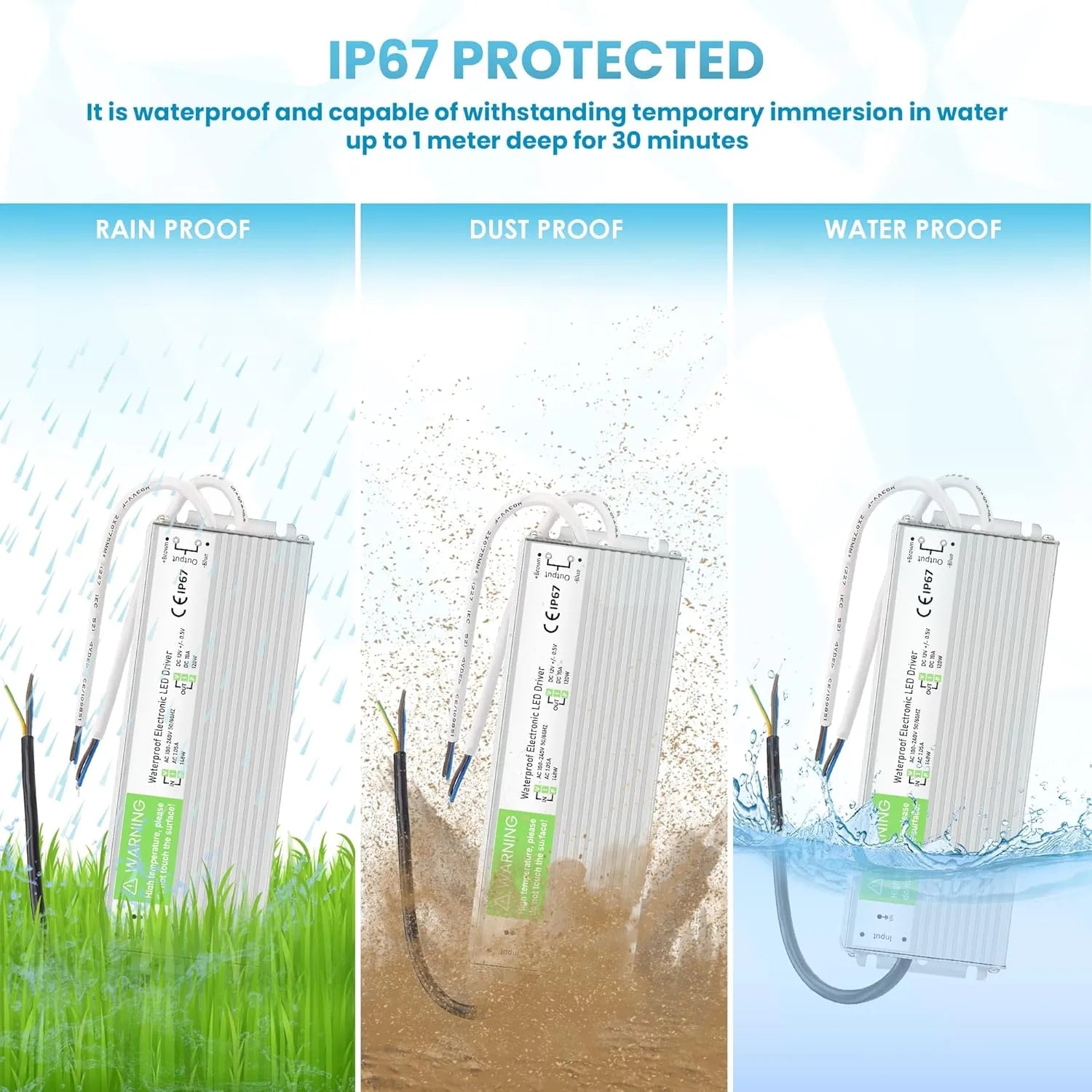 - De waterdichte transformator met IP67-classificatie biedt een hoge mate van bescherming tegen het binnendringen van stof en water.
