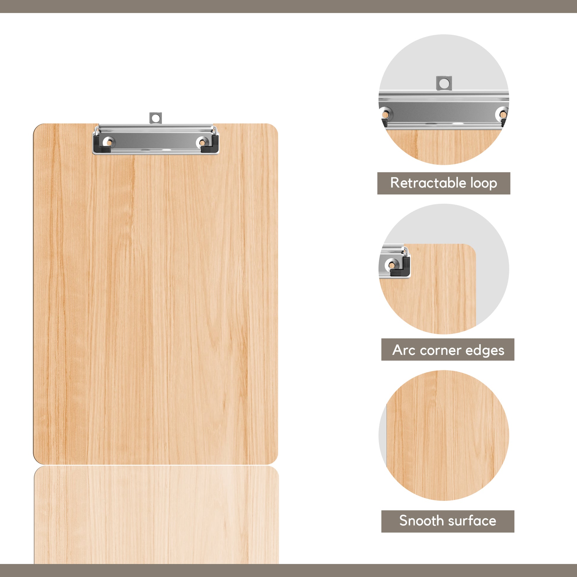 - Map van hout met metalen clip en gladde randen om sneden en krassen te voorkomen.